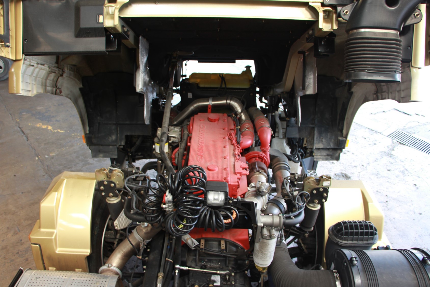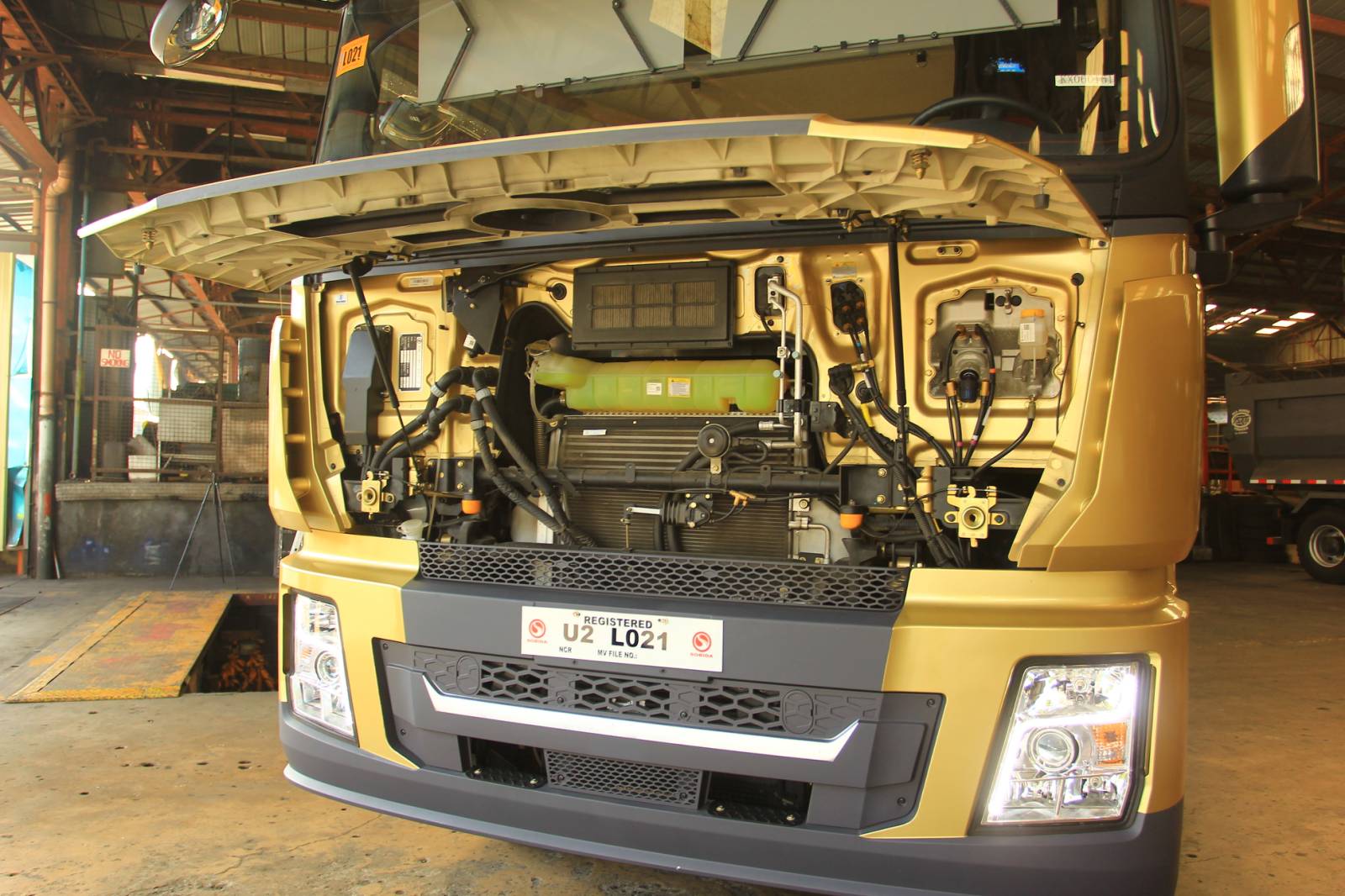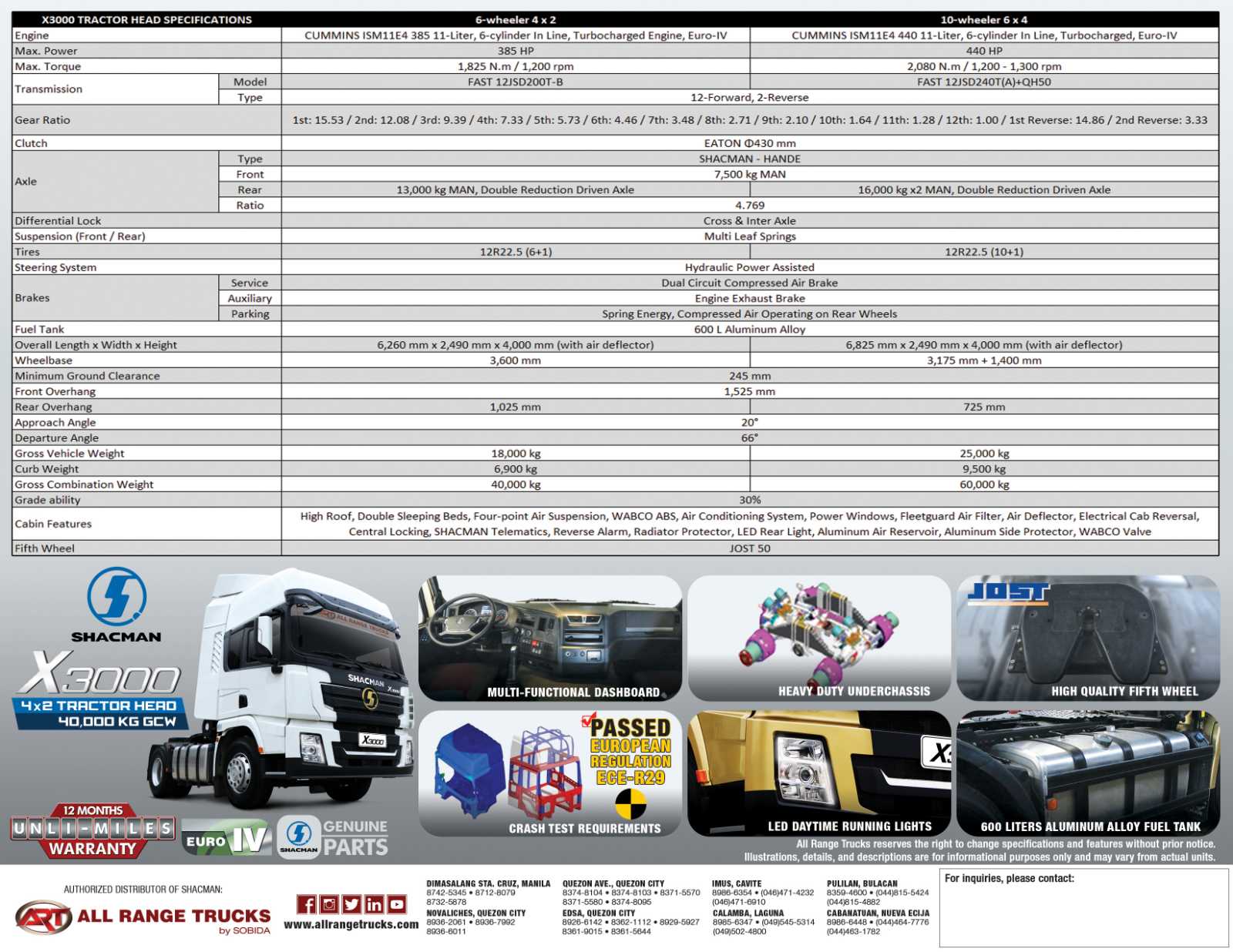 Shacman X3000 SX42564W324C 11-liter CUMMINS ISM CELECT 6-cylinder turbocharged Euro-4 Diesel engine, 440 horsepower, 2,080 N-m/1,200-1,300 rpm torque, 12-speed manual transmission, 10-wheeler 6x4 rear wheel drive, 600 liter aluminum fuel tank, 430 mm diameter EATON clutch, SHACMAN-Hande Axles, 12R22.5 (10+1) tires with rim trim cover, multi-leaf spring suspension, WABCO braking technology, length: 6,825 mm, width: 2,490 mm, height: 4,000 mm, wheelbase: 3,175 mm + 1,400 mm, Gross Vehicle Weight: 25,000 kgs, Curb Weight: 9,500 kgs, Gross Combination Weight: 60,000 kgs, high roof, double sleeping beds, four-point air suspension, air conditioning system, Grammer air suspension driver seat, Jost fifth wheel, Fleetguard air filter, HID headlamps with Adaptive Front Lighting System with LED Daytime Running Lamps, electrical cab reversal, central door locks, Cruise Control, electric heater side mirrors, SHACMAN telematics, WABCO Antilock Braking System (ABS), WABCO valve, Aluminum Air Reservoir, Aluminum Side Protector; 12-months unlimited mileage new vehicle warranty.